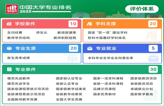 排名采用独具特色的学校、学科、专业三层次专业竞争力评价框架,设置学校条件、学科支撑、专业生源、专业就业、专业条件5个指标类别和27项指标,对1200多所高校的6万多个本科专业点进行动态监测式评价。“软科中国大学专业排名”旨在为学生和家长选择本科专业提供客观参考,也为高校的本科专业建设与分析提供数据支持。