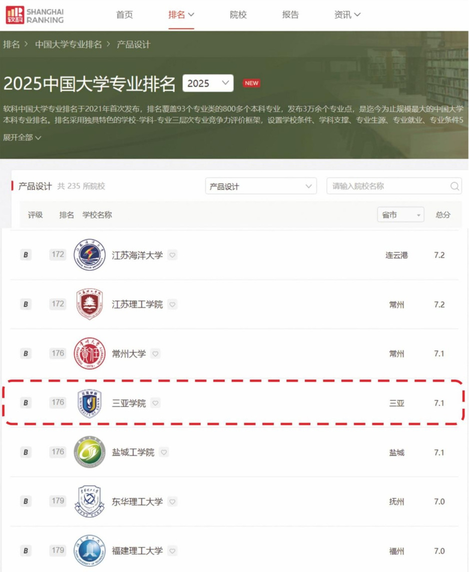 另外,根据2025年6月高等教育专业评价机构软科正式发布“2025软科中国大学专业排名”,排名包括836个专业,涉及93个专业类、12个专业门类。在产品设计专业排名中,我校的产品设计专业在235所大学中排名为第176位。这也是对我们专业办学的肯定,也是鼓舞我们前行的动力。