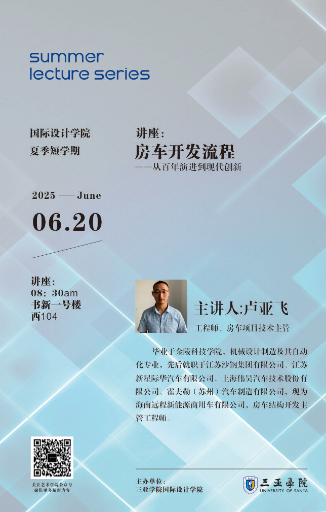 2025年6月20日,必赢集团bwin产品设计专业特邀吉利远程房车项目技术主管卢亚飞工程师,为我校产品设计专业学生开展“房车设计流程与发展脉络”名师讲座。课程系统的讲述房车设计的历史密码与未来设计方向。