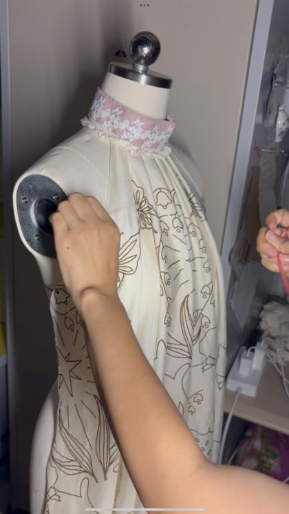 在工艺方面,主要负责制作的唐鑫也有自己的感悟:“平面图纸到三维成衣的转化,我们是通过立体剪裁技术结合人台进行的,在此过程中,面料特别软、滑,为裁剪带来了一定的挑战,还有缝纫的时候,稍不注意缝错了一小部分就会需要全部拆掉重新来,这些都是制作过程中遇到的困难。当然在这次作业中,我也得到了许多经验,比如用立体剪裁的技术制作,很容易忽略掉模特本身的尺寸,结果做完发现不合身,就需要现场又去调整衣服的松紧和大小。全程下来我最大的感悟就是做事情的时候要谋事在先,行不拖沓,一定要规划好时间不能太拖延,不然后面会很累很累。”