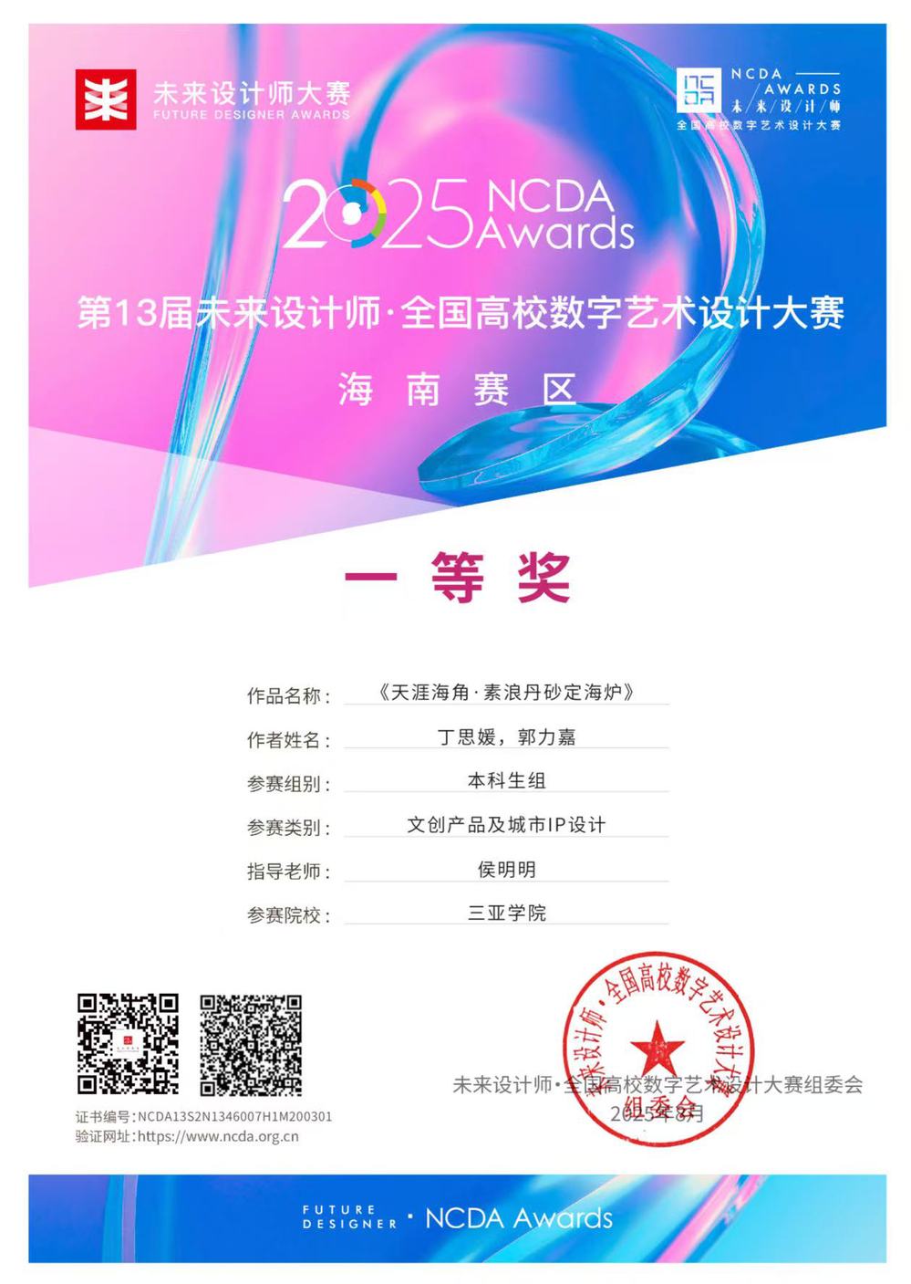 在2025年未来设计师·全国高校数字艺术设计大赛(NCDA)海南赛区评选中,必赢集团网站产品设计专业学子表现优异,据悉本次NCDA大赛吸引全国1876所高校参赛,我校产品设计专业学生共斩获一等奖1项、二等奖1项、其中由丁思媛、郭力嘉团队创作的《天涯海角·素浪丹砂定海炉》以海南赛区一等奖的成绩晋级全国总决赛,秦梓岩同学创作的《跨界融合的概念交通工具设计》以海南赛区二等奖的成绩晋级全国总决赛,充分展现了我校产品设计专业方向中“地域文化创意设计”和“吉利汽车前瞻设计”两大方向的产教融合的教学成果。
